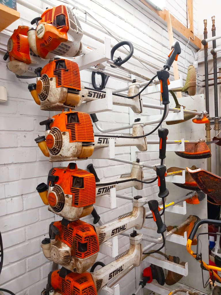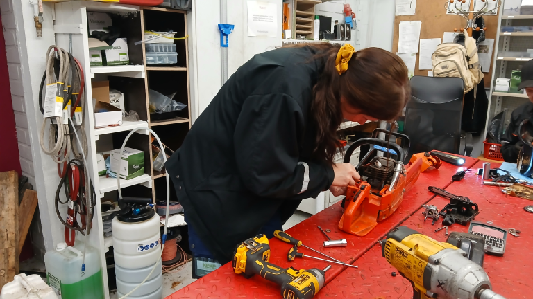 Aki antoi työntekijöilleen tehtäväksi perehdyttää minua lähiaikojen työtehtävistä sekä siitä, mitä tänään on luvassa – hehän parhaiten sen päivän hommat osaavat kertoa. Kuulin, millaisia koneita pienkonekorjaamolla yleisesti huolletaan ja korjataan sekä minkälaisilla välineillä. Perehdytyksen jälkeen sain eteeni päivän ensimmäisen tehtävän: purkaa moottorisahaa ja ottaa siitä kierrätettäviä osia talteen jatkokäyttöä varten. Minulle tarjottiin ensin työhanskoja, mutta kysyin, onko pakko, sillä koen saavani paremmin tuntumaa ilman. Minun ei tarvinnut käyttää hanskoja koko aikaa, mutta tiettyihin tehtäviin ne ovat pakolliset. Aloitin työn mielelläni ja innoissani. Oli helpottavaa, että pystyin vain purkamaan laitteen, ilman varovaisuutta siitä, etten vain hajota mitään. Purinkin moottorisahaa tarmokkaasti, kunnes minua ohjannut työntekijä huomasi, että olin purkanut jo aivan liikaa – olin siis ottanut liian kirjaimellisesti sen, että kone puretaan osiin. Selvisin väärinymmärryksestäni laittamalla muutaman ruuvin takaisin paikoilleen. Aikani aherrettuani sain tehtävän valmiiksi. Siitä lähdimmekin seuraavaksi pienelle tauolle.